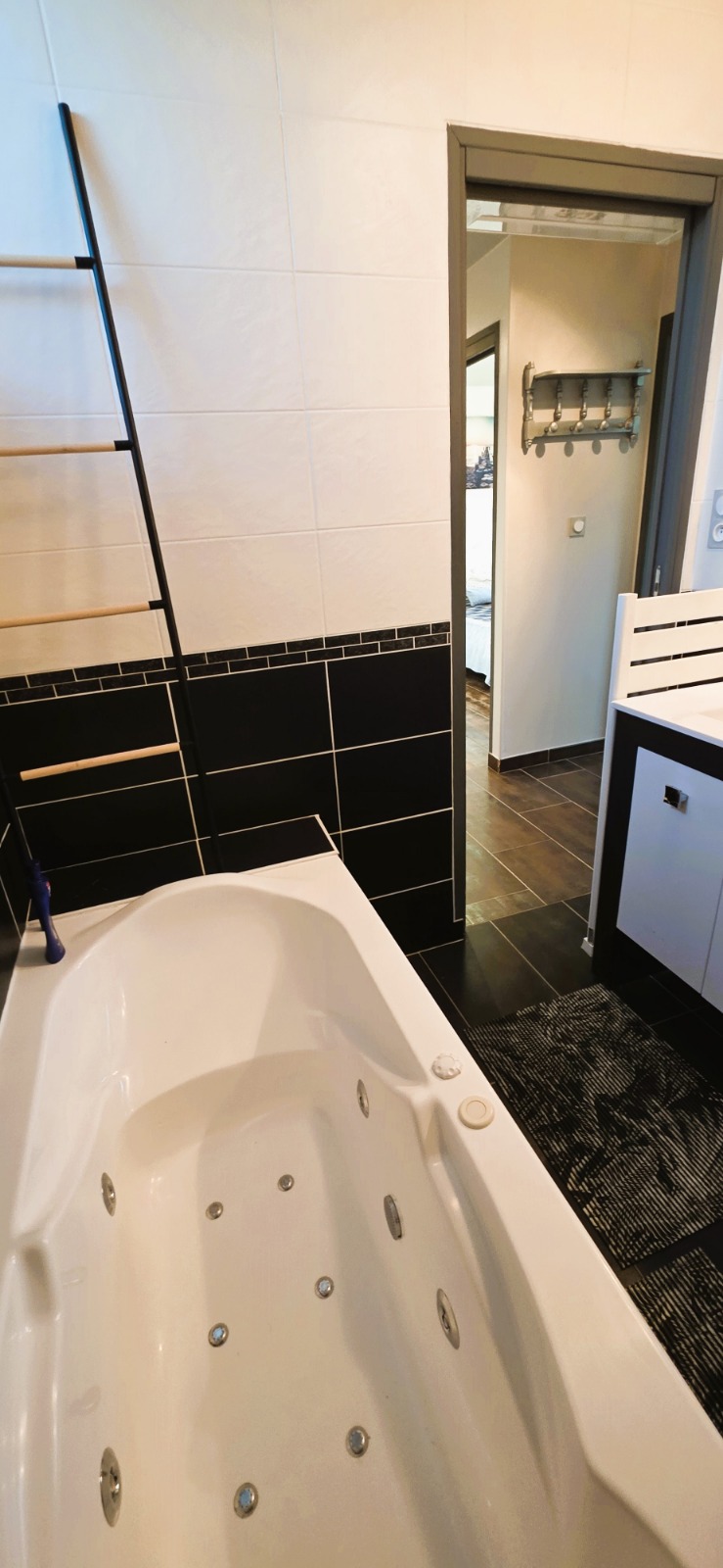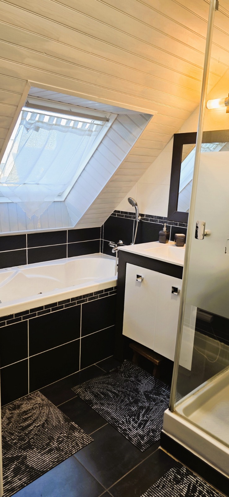 Baignoire balnéo, grande douche 90x90 avec robinet thermostatique, vasque en porcelaine, sèche-cheveux.