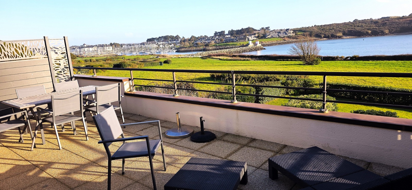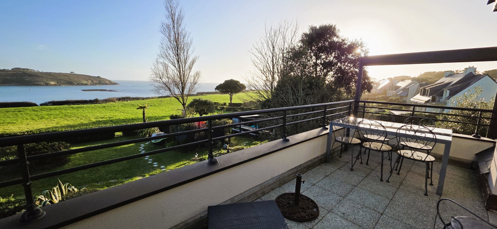 Depuis votre terrasse de 12m² équipée de mobilier de jardin, barbecue et parasol, découvrez un vaste panorama sur la mer. Vos soirées détente après un barbecue vous laissent contemplatifs, face au clair de lune se reflétant sur la Baie de Quiberon et les lumières des îles se mêlant à l'horizon nocturne.