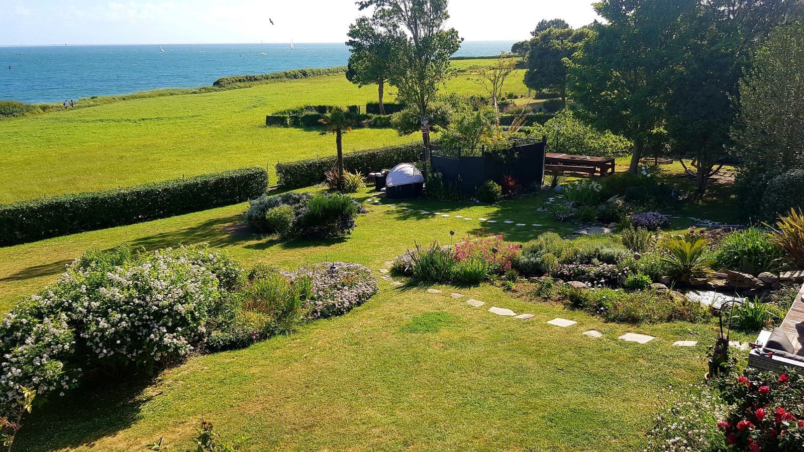 Depuis votre terrasse de 30m² équipée de mobilier de jardin, barbecue et parasol, découvrez un vaste panorama sur la mer. Vos soirées détente après un barbecue vous laissent contemplatifs, face au clair de lune se reflétant sur la Baie de Quiberon et les lumières des îles se mêlant à l'horizon nocturne.