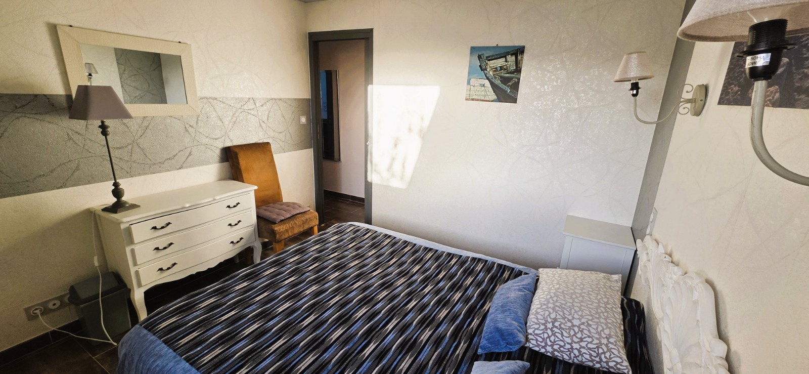 Ambiance romantique avec lit king-size, tête de lit en bois sculpté. Lit bébé disponible.