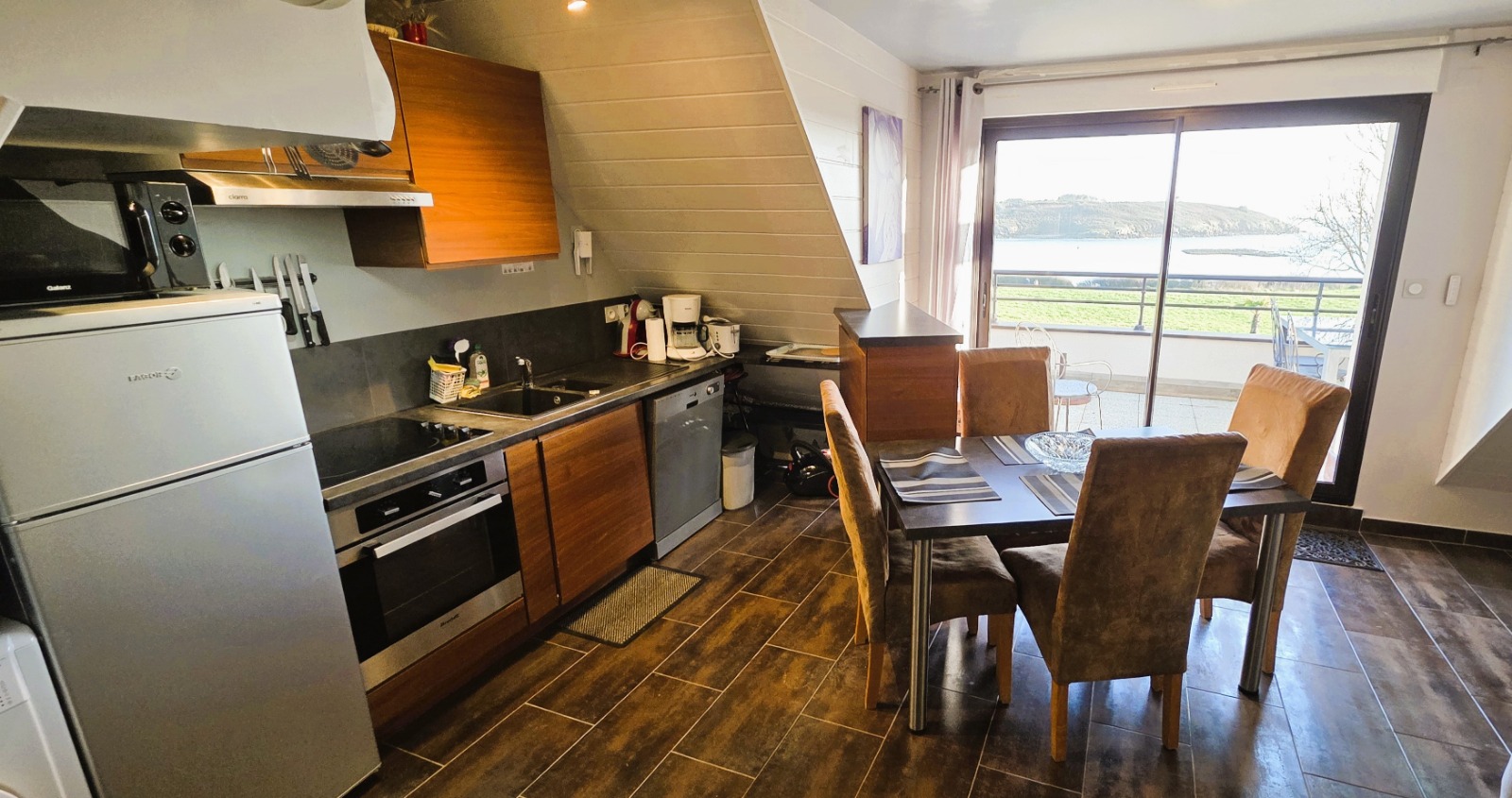 Cuisine lumineuse et fonctionnelle avec vue mer. Lave-vaisselle, four, plaques vitrocéramiques, micro-ondes, réfrigérateur-congélateur.