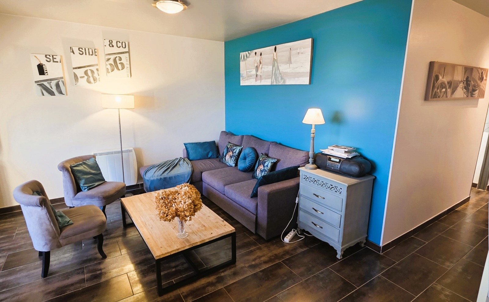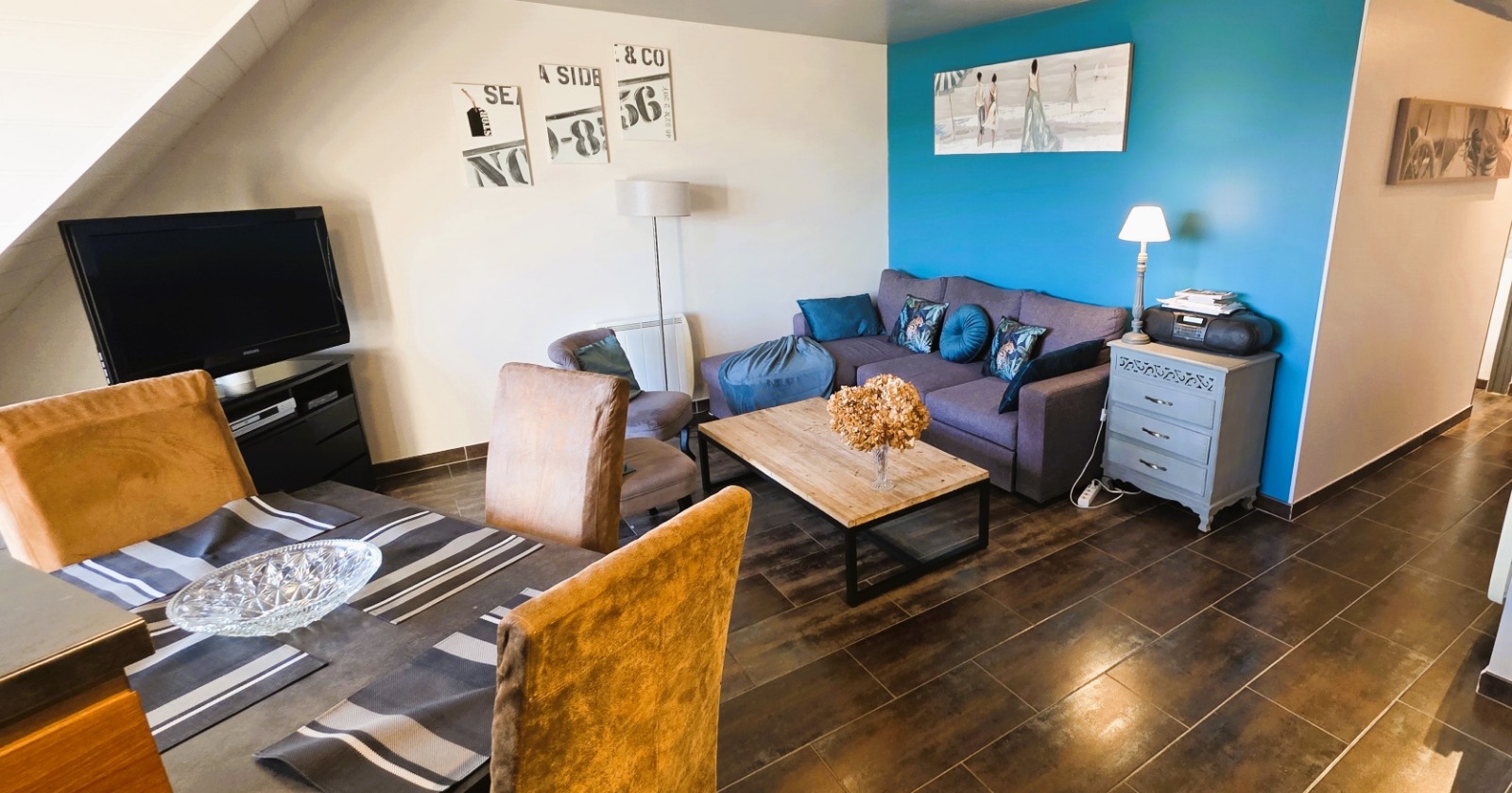 Séjour d'inspiration yachting avec canapé d'angle convertible, fauteuils club. Accès direct terrasse. WiFi gratuit inclus.